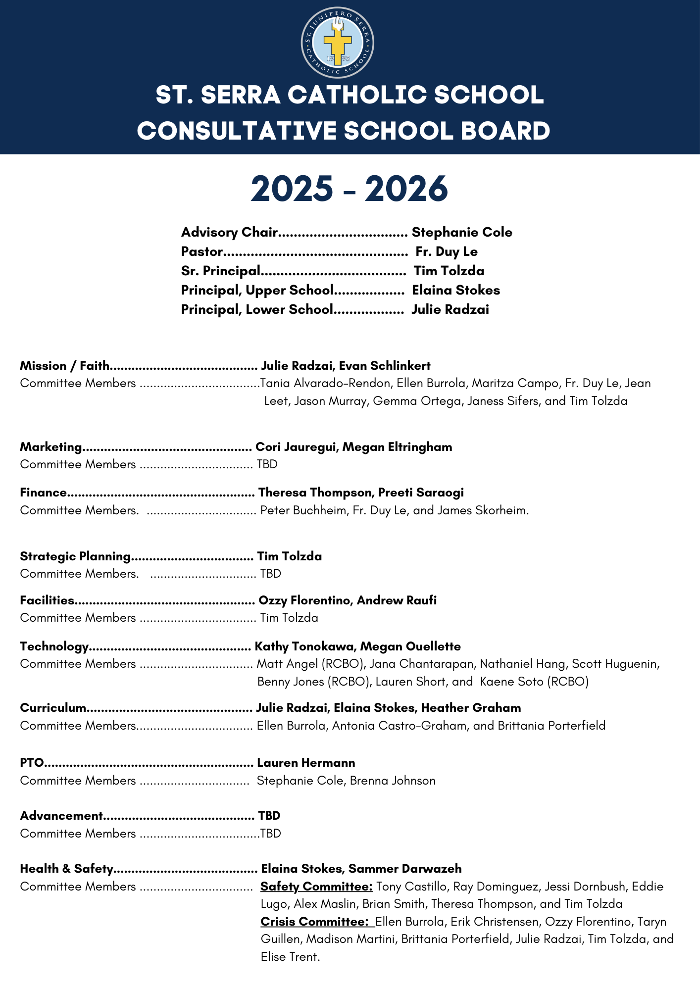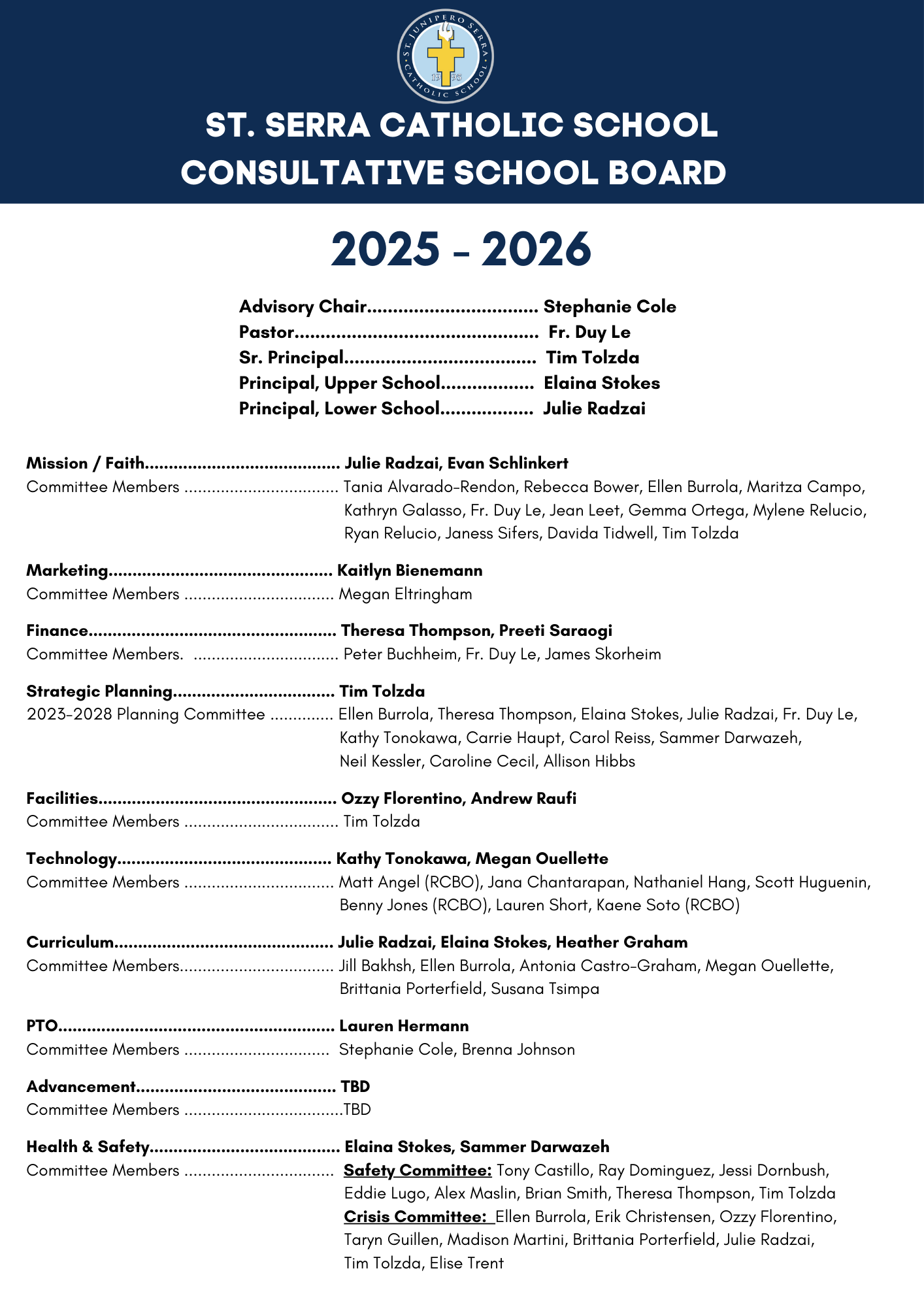 The Consultative School Board is an advisory body to the Lead Pastor and Senior Principal in the administration of the school, which provides additional leadership, direction, and support to the school community. In addition to the Lead Pastor and Senior Principal, it is composed of members of the Leadership Team, school staff, and school parents, some of whom have specialized expertise in areas such as finance, marketing, or education.